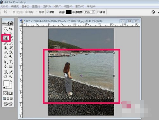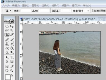 3、把图片弄正以后,如何把竖版的图片处理为横版图片呢?第一种方法可以用裁剪法,点击工具箱中的裁剪工具对图片进行裁剪,使用这种方法的缺点是图片上有些风景就会被裁剪掉。