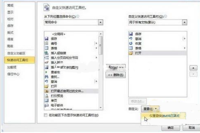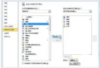3、重复步骤2可以向Word2010快速访问工具栏添加多个命令,依次单击“重置”→“仅重置快速访问工具栏”按钮将“快速访问工具栏”恢复到原始状态。