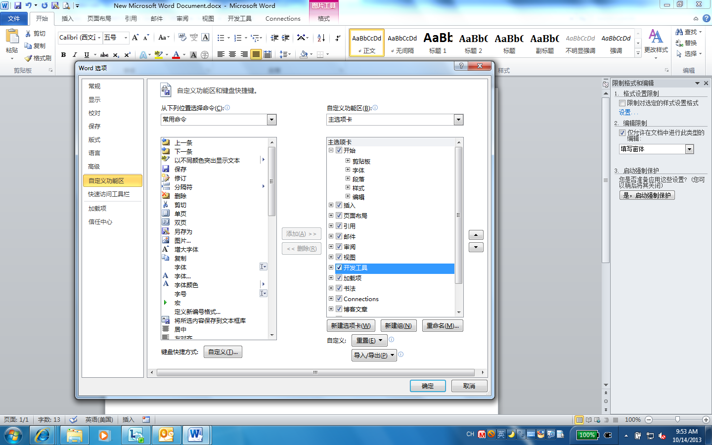 第二步,点选“自定义功能区”,并在最右边找到“开发工具”并勾选中,然后确定