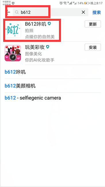 2、在应用市场搜索栏中输入“b612咔叽”,单击搜索一下,出现的软件进行下载并且安装