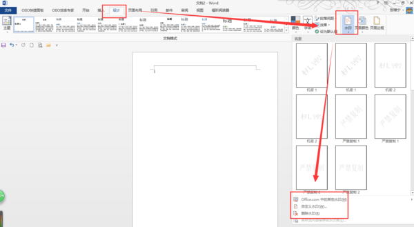 打开word,点击设计选项卡,在页面背景命令组点击水印命令,可以添加水印。系统提供了默认的水印样式。