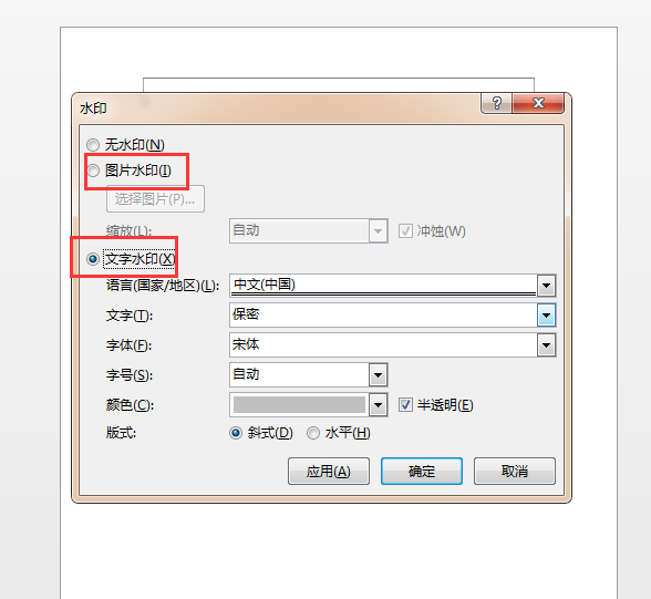 2、在弹出的“水印”对话框中进行以下操作: