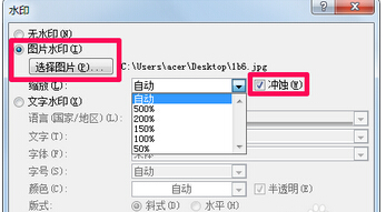 (1)单击“图片水印”,单击“选择图片”命令。找到图片并双击,在“缩放”选项的右侧选择缩放比例,可选中“冲蚀”或取消勾选,单击“确定”。