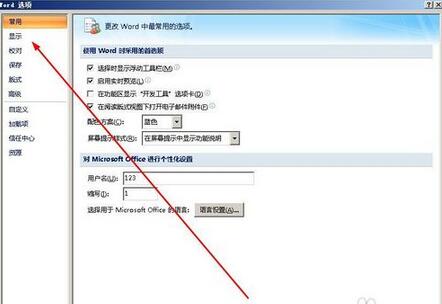 3,在word选项中,点击显示选项。