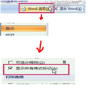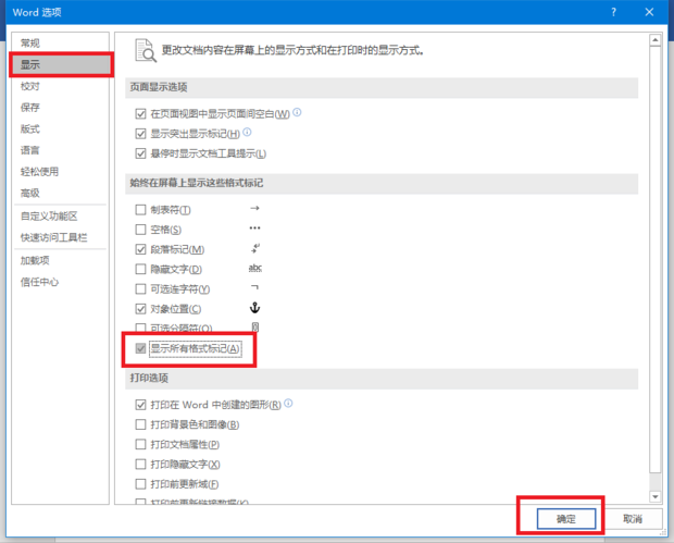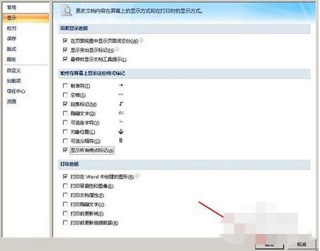 点击“显示”,再勾选“显示所有格式标记”,点击“确定”