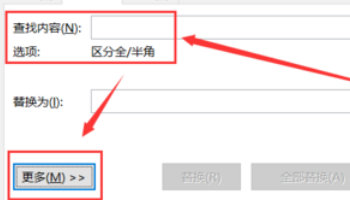 3、在“查找和替换”对话框中,把鼠标放在“查找内容”后面的输入框中,点击下方的“更多”。