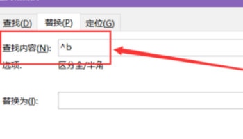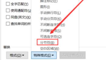 5、由于例文的正文中只有分节符,这里只在下拉菜单中点选“分节符”,在“查找内容”输入框中就会被输入“^b”字符。