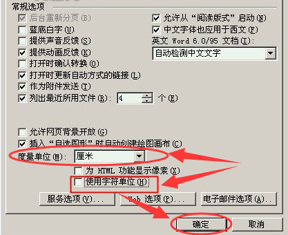 2、在“常规”选项卡中有一个“度量单位”,并且在栏中明显输入的计量单位是“厘米”。但注意:不要被已经填好的“厘米”蒙骗了,其实在它的下面有一个打“√”的“使用字符单位”的复选项,接下来只要把这个复选项的“√”去掉,并单击“确定”按钮即可。