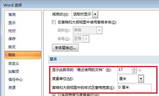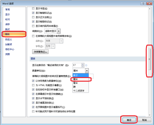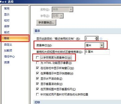 在弹出的对话框中切换到【高级】选项卡,拖动右侧滚动条拉至【显示】一栏,发现【度量单位】已经设置为厘米了,现在只需将【以字符宽度为度量单位】前的勾单击取消即可。完毕后单击【确定】。
