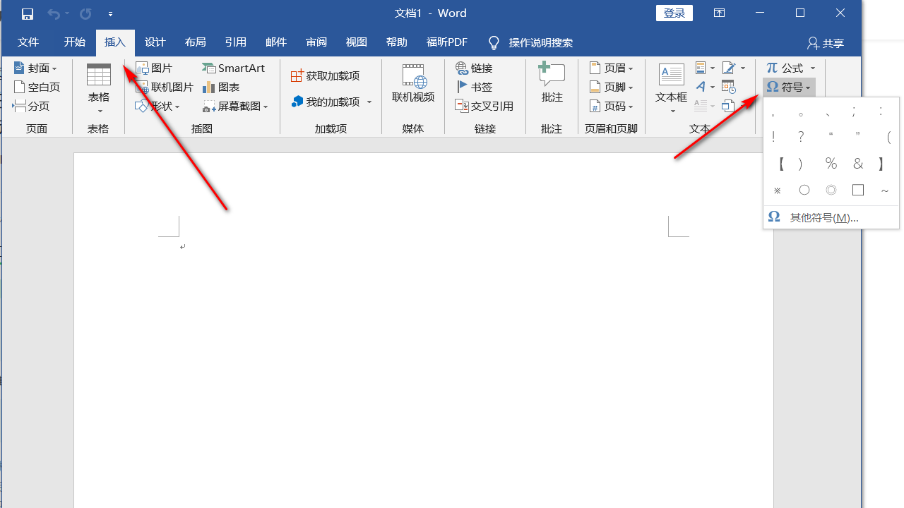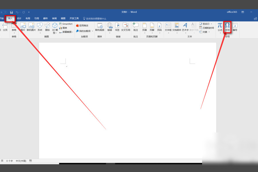 2、然后,在打开的Word文档中,点击上方菜单栏里的插入选项,再点击插入选项下面的符号。