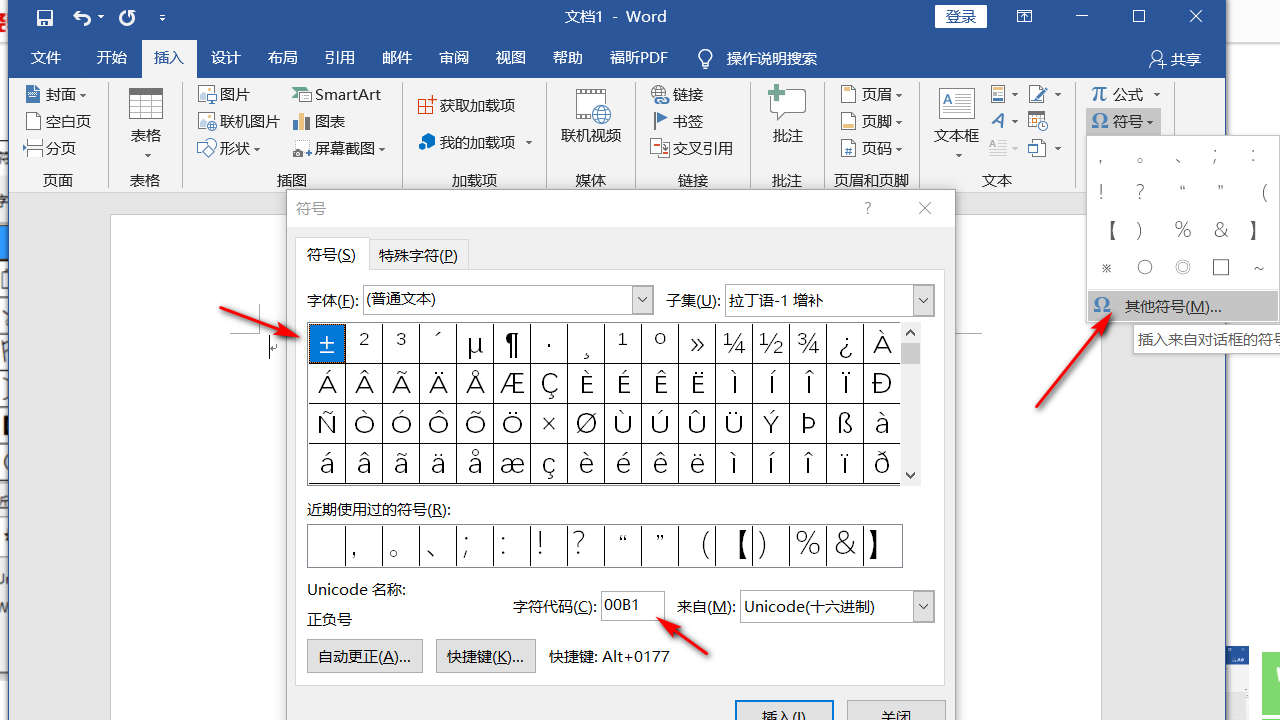3、点击其他符号,进入符号选择页面在字符代码处输入00b1,可以找到正负号。
