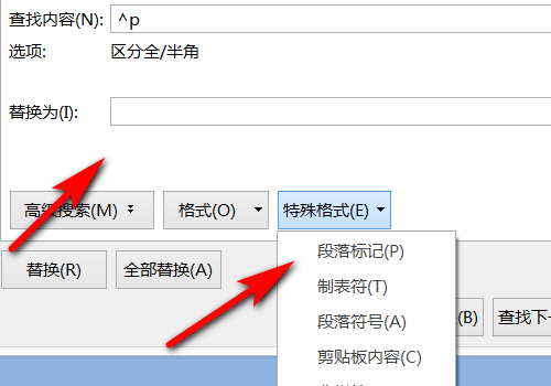 4、将光标移到查找内容里面,并选择特殊格式里面的段落标记,然后在替换为输入一个空格。