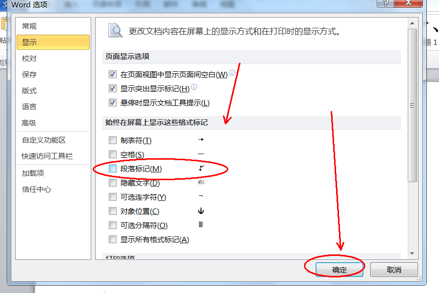 4、在右侧找到“段落标记”,取消其前方的选勾符号,然后点击确定。