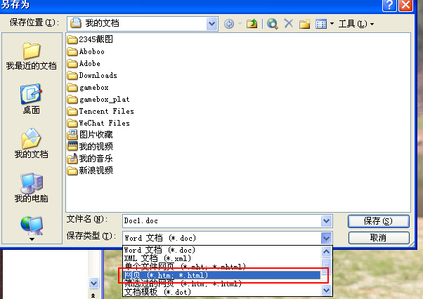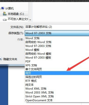 3,在打开的另存为窗口中,点击保存类型选项卡,在弹出的菜单中选择“网页”,然后点击保存按钮,这样就把刚才打开的word文档先转换为网页格式了。