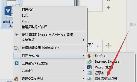 4,找到刚才保存的网页,然后在文件上点击右键,在弹出菜单中选择“打开方式"菜单项,然后选择“搜狗浏览器”,使用搜狗浏览器打开刚刚保存的网页。