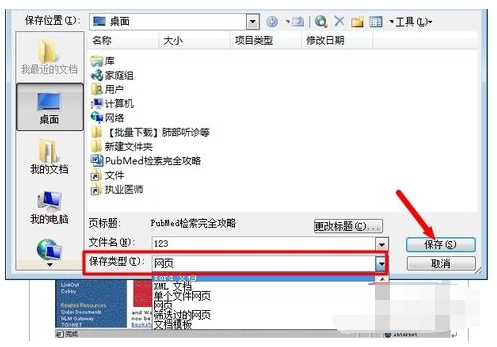 3.将其另存为,在文件类型出选择【网页】,保存在桌面上。