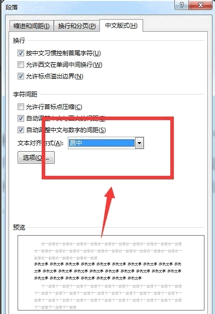 3.在打开的窗体中,选中“中文版式”页,找到其中的“文本对齐方式”项(位于该页最下方),选择对齐方式为”居中“,如下图所示。