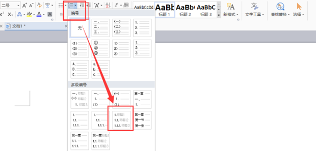 2.如图可以选择多级编号的样式,如果选择三级以上的多级标题可以选择图示的多级编号。这种多级编号可以无限叠加多级编号。