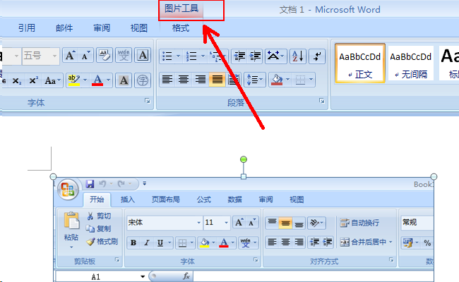 2、然后单击选中目标图片,选中之后就可以在上方的工具栏处看到【图片工具】字样。