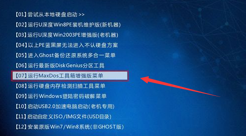 1、将制作完成u深度u盘启动盘连接至电脑,重启电脑等待出现开机画面时按下启动快捷键进入启动项窗口,选择【07】运行MaxDos工具箱增强版菜单,按回车键确认,如下图所示: