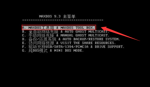 3、进入到MAXDOS 9.3 主菜单界面后,选择“A.MAXDOS工具箱”,按下回车键确认,如下图所示: