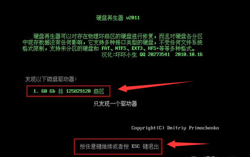 5、进入到硬盘再生器后,它会自动扫描出当前计算机的磁盘驱动器,我们按下任意键继续操作,如下图所示: