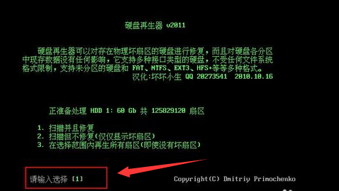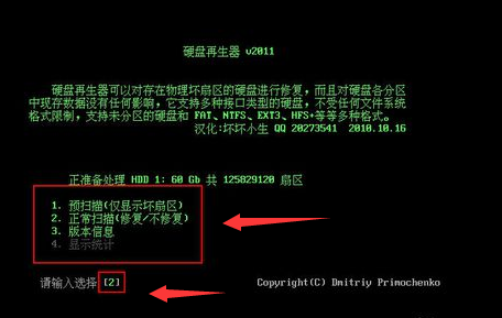 6、接着选择我们要进行的操作,输入功能前面的数字即可,我们输入“2”来扫描硬盘,如下图所示: