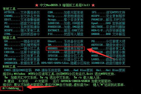 4、然后在MAXDOS工具箱中找到“硬盘再生程序”选项,在下方的光标处输入“hddreg”指令(不区分大小写),按下回车键确认,如下图所示: