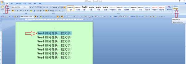 1.打开word文档,选中需要替换的一段文字,按“Ctrl+C”键复制该段文字,单击“开始”菜单下的“替换”命令,如下图: