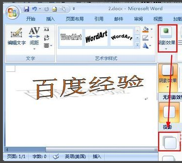 4、首先是阴影功能,是最主要的功能,使用后艺术字显示阴影光效,在文字后会有阴影显示。