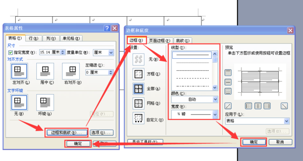 2、在【表格属性】对话框【表格】标签页下点击【边框和底纹】。随后就会弹出【边框和底纹】对话框,接着就可以在这里设置边框的【线型】、【颜色】和【宽度】(粗细)了。设置好了之后,点击【确定】,返回到刚才的【表格属性】对话框,再次点击【确定】即可。