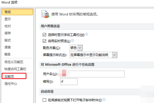 2、点击选项后,会弹出【Word选项】窗口,点击左侧菜单的【加载项】。