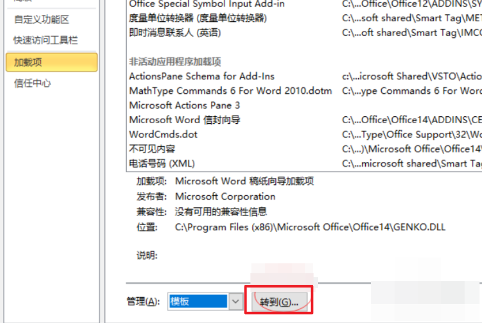 在word选项中,点击加载项,找到MathType Commands 6 For Word.dotm在下方的管理处选择模板,然后点击转到进行下一步操作。