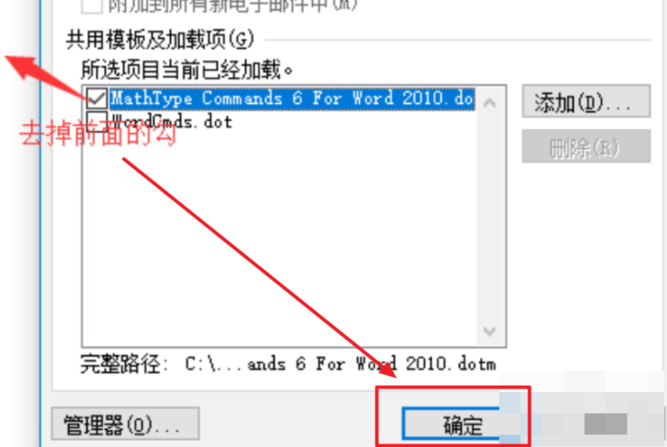 5、在【共用模板及加载项】中可以看到【MathType Command 6 For Word 2010”前面的勾选框是选中的,讲勾选去掉,再点击右下方的【确定】。就解决了word快捷键粘贴不能用的问题。