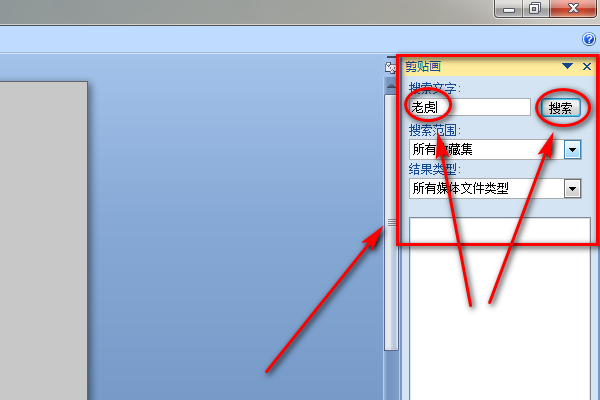 4、在剪贴画选择界面,输入需要图片名称,并点击搜索。