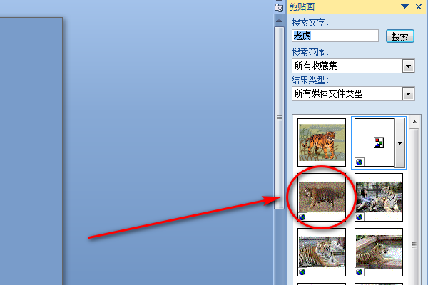 打开剪贴画窗格,单击“搜索”按钮即可显示所有媒体文件类型的剪贴画,搜索完后在列表框中选择要作为水印的剪贴画