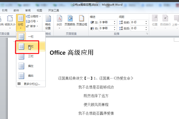 单击“页面布局”选项卡,在“页面布局”功能区中单击“分栏”按钮,打开一个下拉菜单,如下图所示,从中选择相应的栏数即可。
