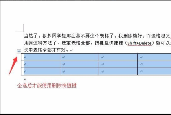 6、当然了,很多同学想那么我不要这个表格了,我删除就好,而退格键又删不了时,那么就要用到这种方法了。选定表格全部,按键盘快捷键(Shift+Delete)就可以删除了,记住一定要选中表格全部才有效。