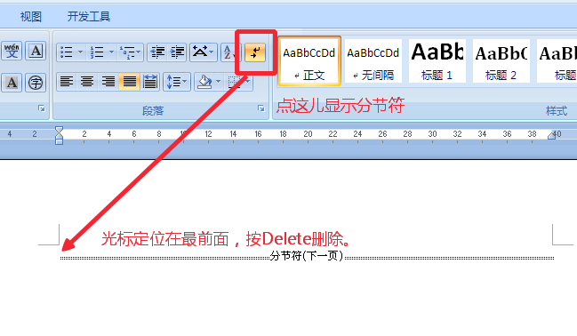 4、把光标移动到分节符所在行,然后按【Delete】键删除。(必须按【Delete】键,退格键是删除不了的)