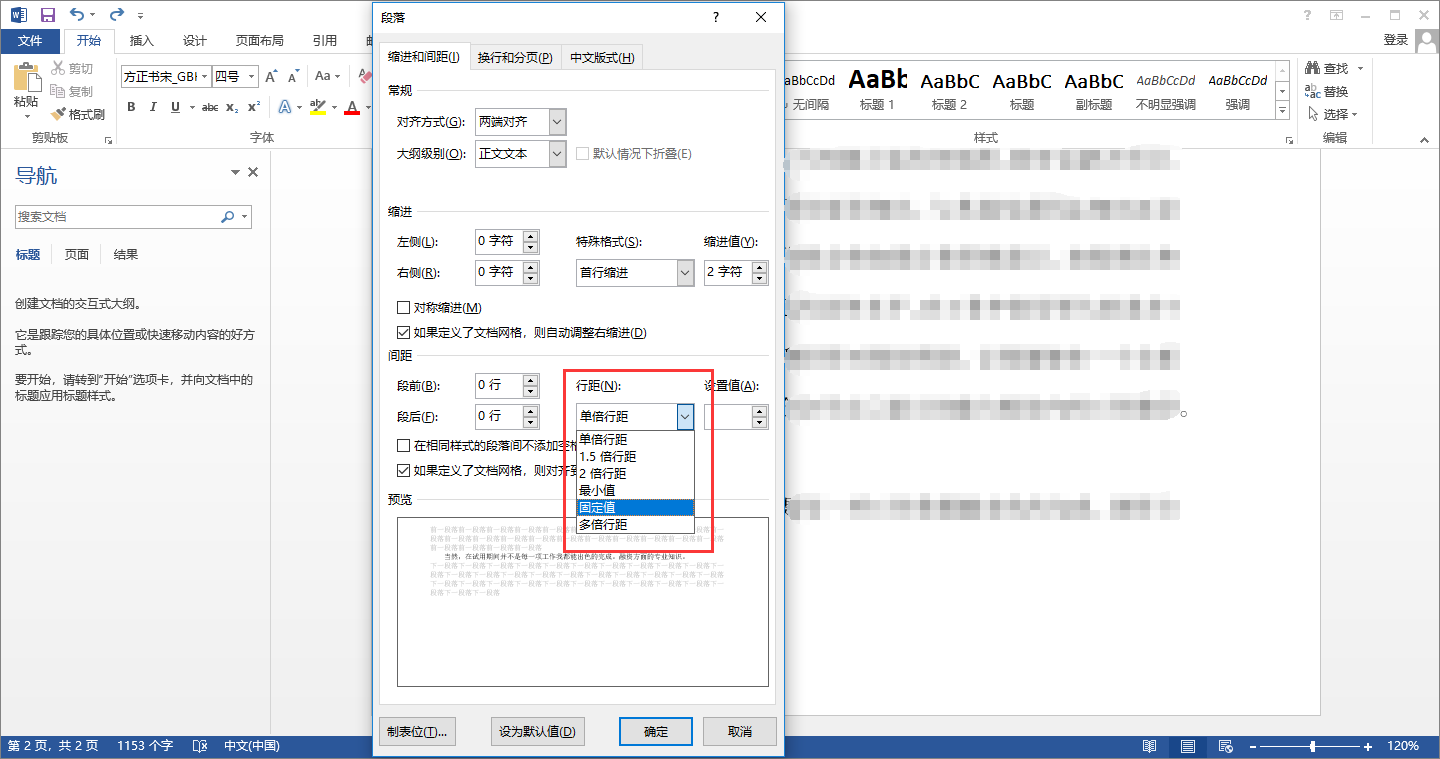2、调整行距,设置行距的数据(根据实际情况而定),通过调整行距也可以删除空白页。