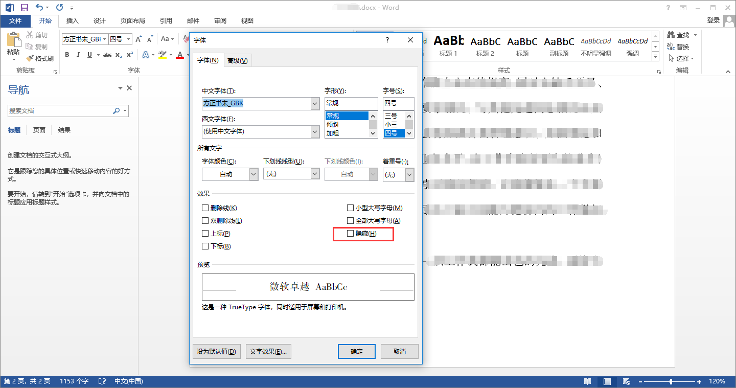 2、打开“字体”功能款,勾选“隐藏”效果即可。