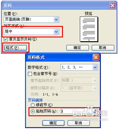 在“第三页”插入完“分隔符”后,鼠标不要移动,选择菜单栏的“插入”在下拉菜单中选择“页码”,然后将“对齐方式”设置为“居中”,单击“格式”按钮,此时会弹出个“页码格式”窗口,我们选择“起始页码”在里面输入“1”,然后确定。