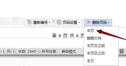3.双击这个页码,进入编辑状态,找到删除页码命令的右下角有一个黑色三角符号,单击一下。