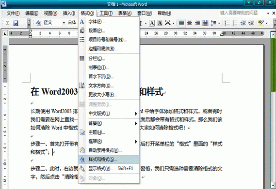 首先打开带有格式和样式的Word文档,然后打开菜单栏的“格式”里面的“样式和格式”。