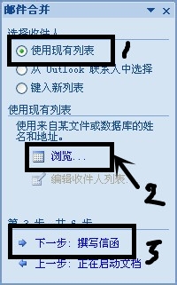 2.在菜单栏----邮件菜单----开始邮件合并----邮件合并分步向导,在文档的左边出现“邮件合并”对话栏。