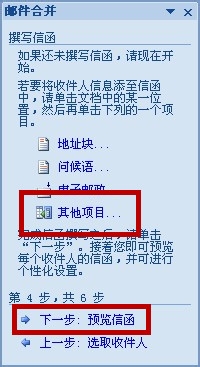 6.回到“邮件合并”栏,选择下一步:撰写信函,选中“其他项目”---出现“插入合并域”,根据需要合并的邮件内容,选择域的内容。比如:姓名栏后面添加姓名域,性别栏添加性别域等等。插入完后,点击关闭。单击“下一步”预览信函---可以就看到第一条记录。