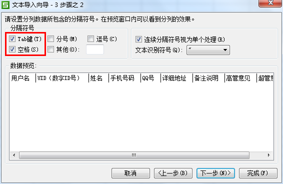6、分隔符号我们选择Tab和空格,下方可以预览数据,之后下一步