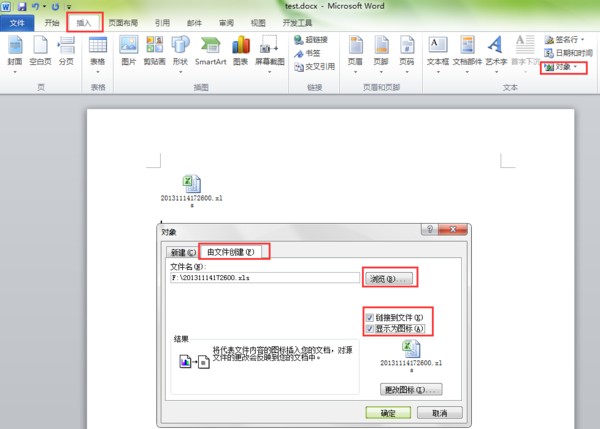 插入-对象-由文件创建-浏览选择文件-勾选“链接到文件”和“显示为图标”-确定