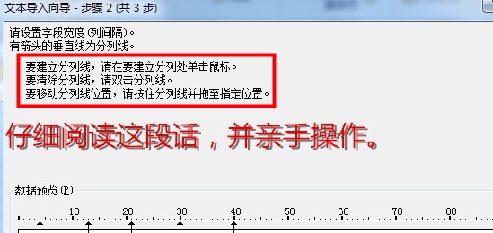 5、设置分行线,其实就是导入数据列数的控制,单击鼠标,可以在任意位置增加分行线。双击任意分行线,就会删除。完成设定后,点击下一步。