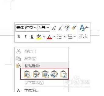 3、当我们点击右键的时候会发现粘贴下有5种选择性粘贴的图标。如下图所示,第一种和第二种是不带有数据链接的,第三种和第四种有原始数据链接,有原始数据链接表示的是假如你在最开始的Excel表格中修改了数据,那么word中的数据也会自动修改,假如删掉了原来的Excel表,那么word中的数据也没有了。然后这两种里面又分别有原格式和目标格式只说,原格式就是Excel表中的格式,目标格式就是word中的格式。而经常为了防止图因为数据修改而出现问题,可以选择第五种选择性粘贴的方式,粘贴为图片。